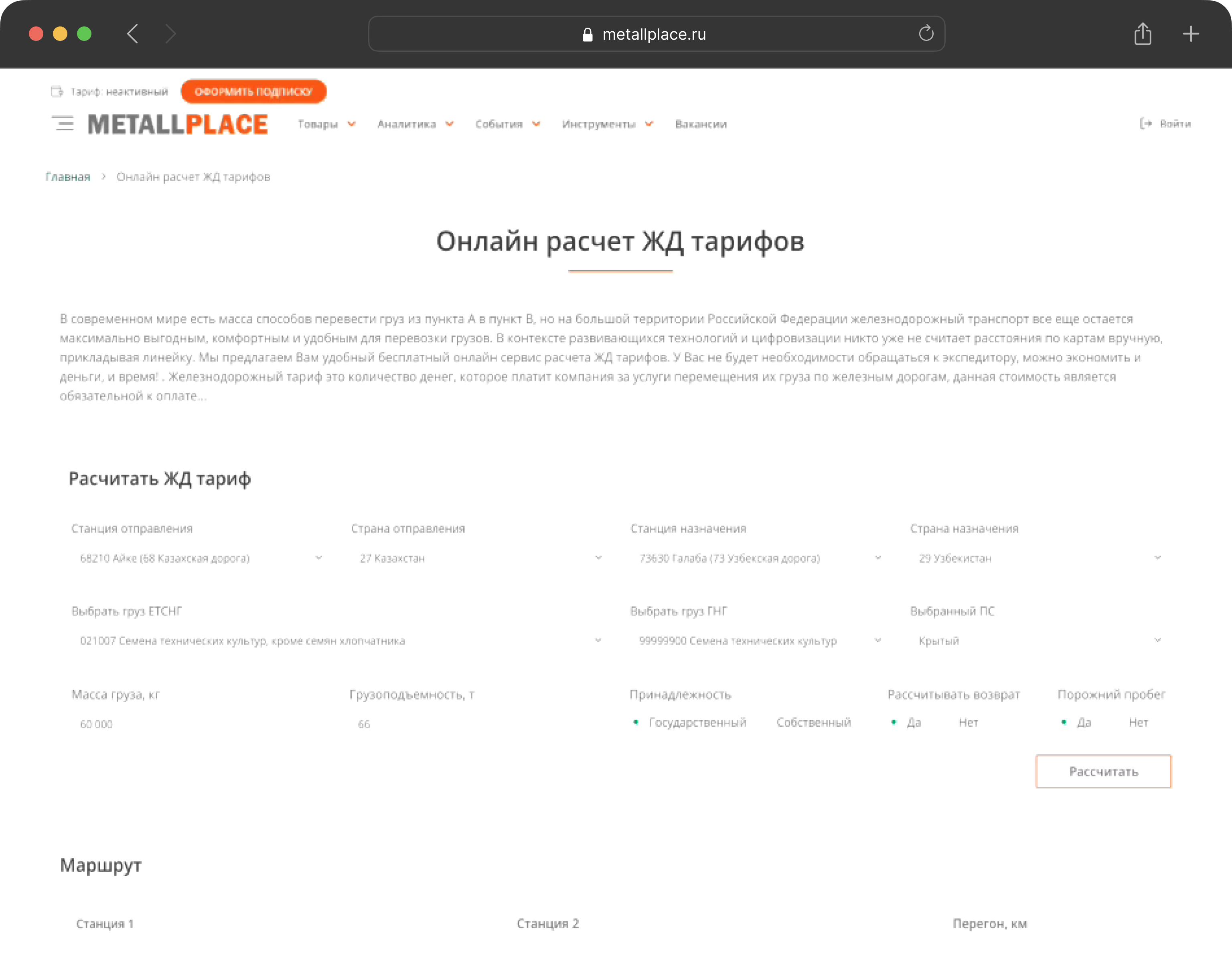 - Расчет жд тарифов. Расчет стоимости за услуги жд перевозок с учетом выбранного типа вагона, объема и веса груза.