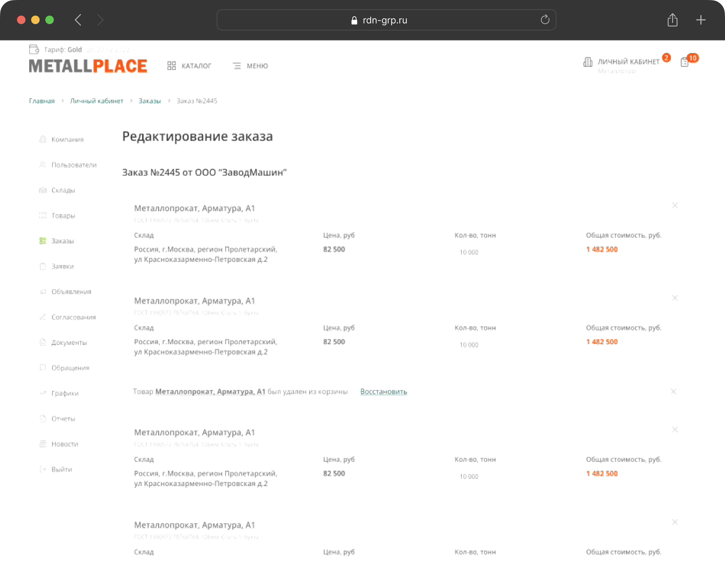 Также имеется возможность рассчитать стоимость доставки жд или автотранспортом. Для отображения предполагаемого маршрута от склада до точки отгрузки интегрирована онлайн карта. И после заполнения всех необходимых условий заявка будет отправлена поставщику.